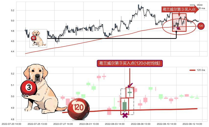 ⚀ 2022-08-04 13:00:00-小时显现 葛兰威尔均线 120小时均线 第③买入点 上升趋势的中继信号,后市看涨,买进信号