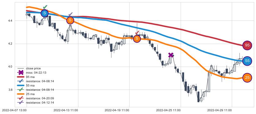 04-07 13:00至05-05 10:00 慢线与快线呈空头排列, 慢线与快线接触少,无缠绕