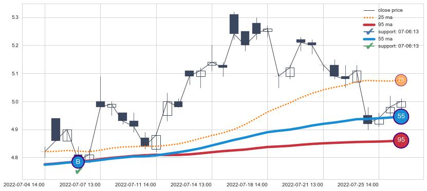 ⚂ 2022-08-11 14:00:00小时突然冒出一根大阳线,一下子顶穿三条均线且收盘价收在各条均线之上