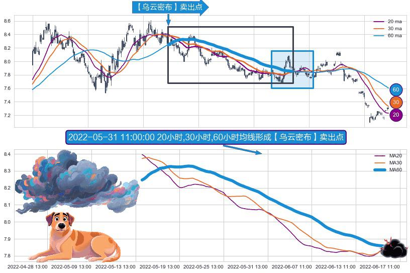 ⚀ 2022-05-16 10:00:00小时-2022-06-16 11:00:00小时显现 20小时-30小时-60小时均线 【乌云密布】卖出点 看空信号,后市看跌,卖出