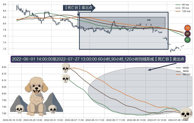 ⚀ 2022-06-02 09:00:00-小时至2022-07-27 13:00:00-小时显现 60小时-90小时-120小时均线 【死亡谷】卖出点 看空信号,后市看跌,卖出