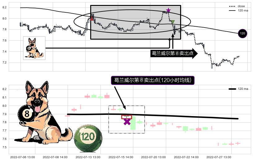 ⚀ 2022-07-15 13:00:00-小时显现 葛兰威尔均线 120小时均线 第⑧卖出点 下降趋势的中继信号,后市看跌,卖出信号