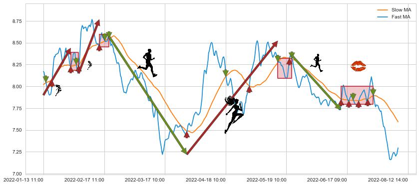 01-26 11:00至02-07 09:00 慢线与快线多次接触,存在上下穿越,有缠绕