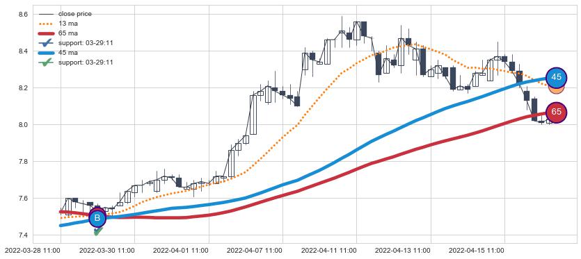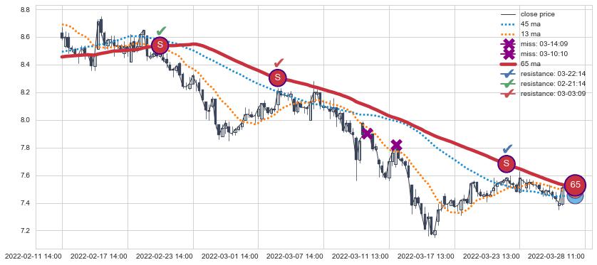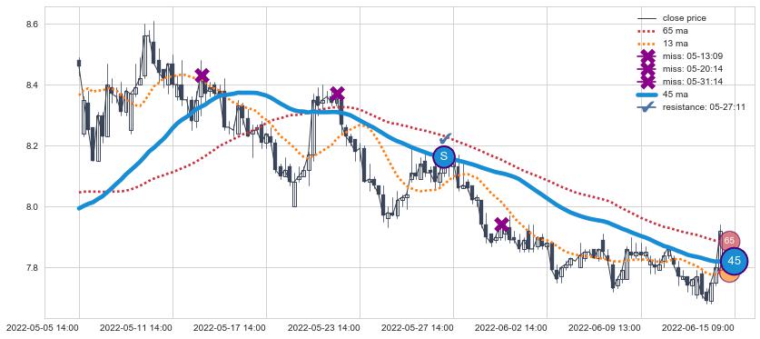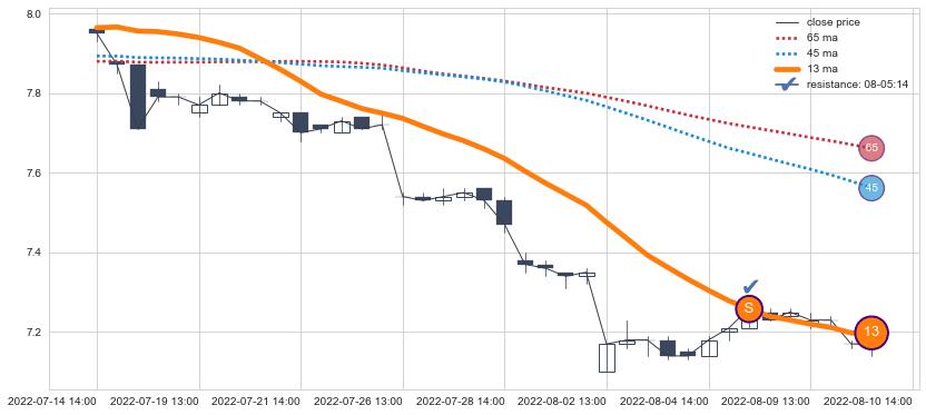 ⚂ 2022-06-15 13:00:00-小时均线向上突破,2022-07-15 13:00:00-小时重新下穿均线破位,均线阻力再次生效
