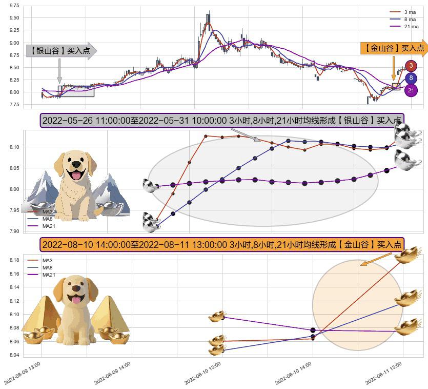 ⚃ 2022-08-11 13:00:00-小时至2022-08-11 13:00:00-小时显现 3小时-8小时-21小时均线 【金山谷】买入点 其再次确认了买入信号,可靠性更强,买入