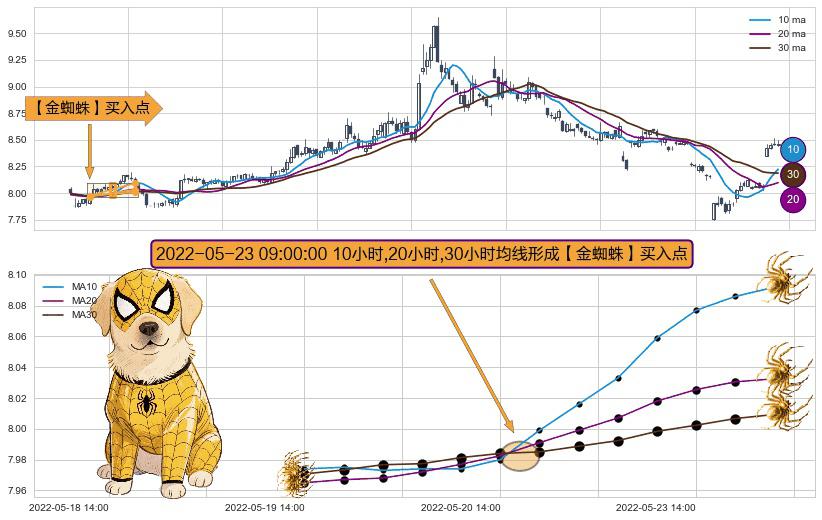 ⚀ 2022-05-23 09:00:00小时显现 10小时-20小时-30小时均线 【金蜘蛛】买入点 看多信号,后市看涨,买入