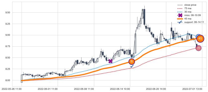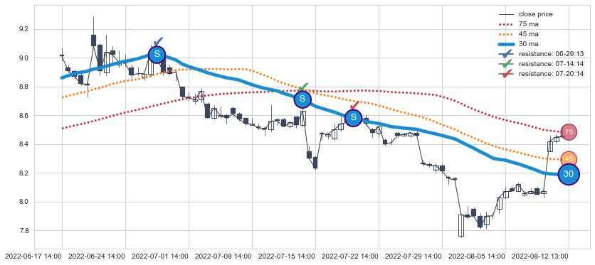 ⚀ 2022-06-28 14:00:00小时-2022-08-12 14:00:00小时显现 30小时-60小时-90小时均线 【高山滑雪】买入点 看多信号,后市看涨,买入
