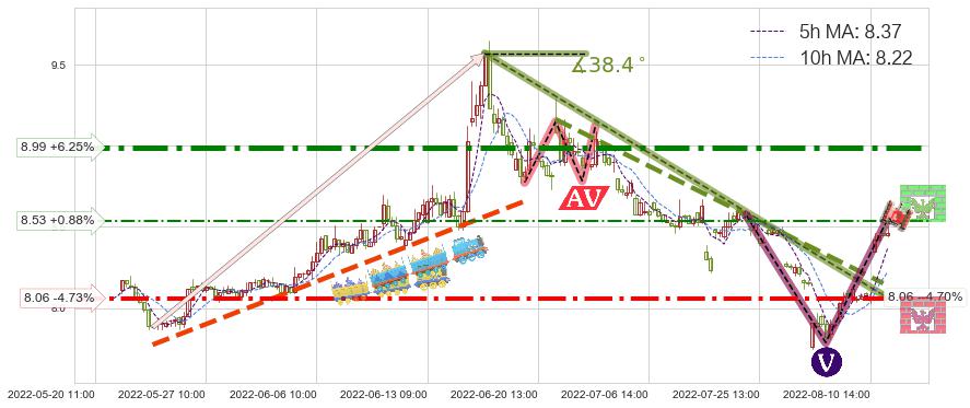⚔️ 2022-06-15 13:00-2022-08-12 13:00下跌趋势存在反转上涨[机会],其原下跌趋势的阻力位(8.06)已被突破[强支撑信号],原下跌趋势角度: 38.4˚