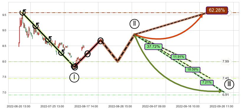 ➢ 循环浪继续向下【最高】位置(09-14:12, 7.99),匹配聚类样本比例31.58%, 可能性概率11.91%