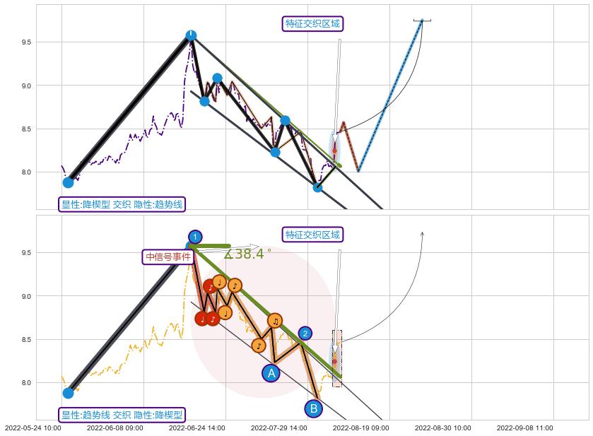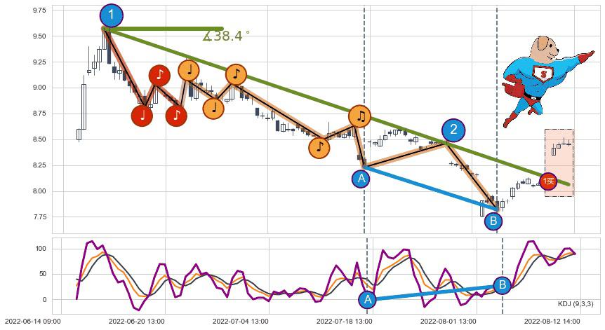 从2022-06-15 13:00至2022-08-12 13:00,共包含91个小时,阶段股价下跌-11.82%,阶段股价变动位移路程比: 1 : 5,下跌趋势角度: 38.4