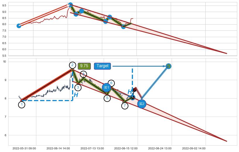 ➢ 高点影线(07-22:14: 8.54 )→回踩→第一根k线低点(07-21:14: 8.53 )