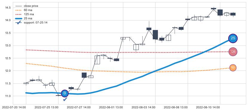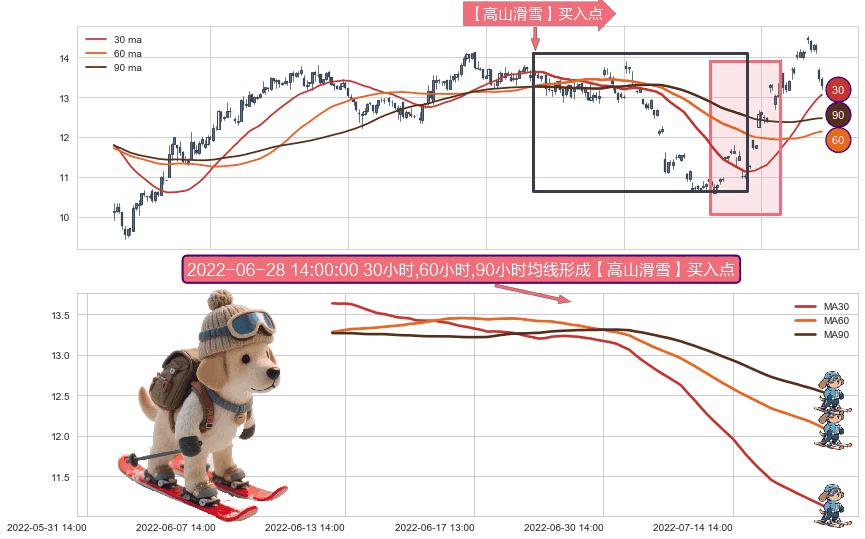 ⚀ 2022-06-13 11:00:00小时-2022-07-25 14:00:00小时显现 30小时-60小时-90小时均线 【高山滑雪】买入点 看多信号,后市看涨,买入