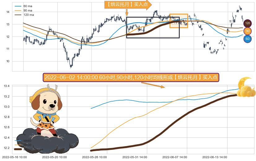 ⚀ 2022-05-24 13:00:00小时-2022-06-15 10:00:00小时显现 60小时-90小时-120小时均线 【烘云托月】买入点 看多信号,后市看涨,买入