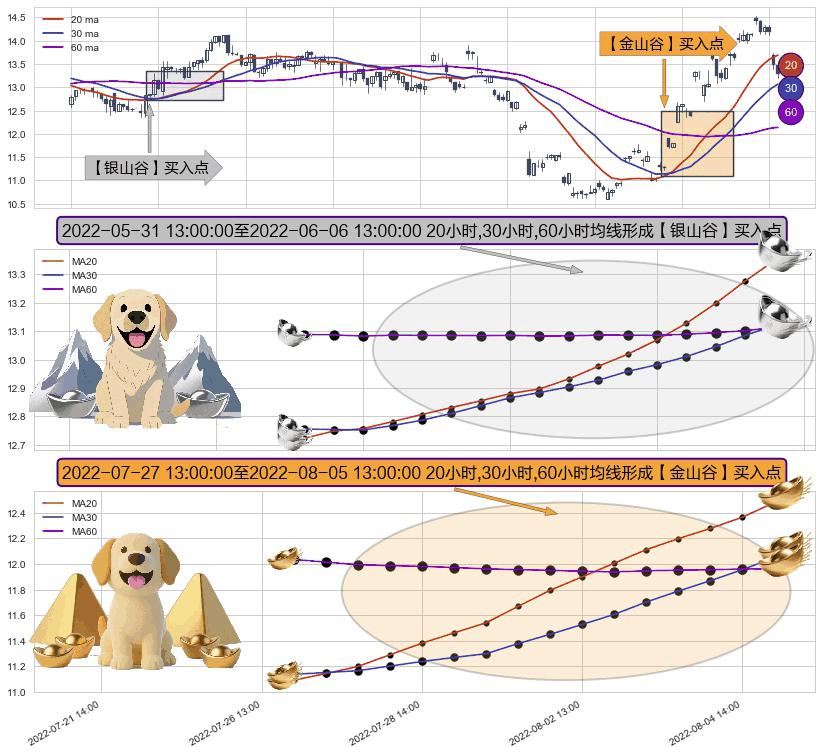 ⚃ 2022-07-27 14:00:00-小时至2022-08-05 13:00:00-小时显现 20小时-30小时-60小时均线 【金山谷】买入点 其再次确认了买入信号,可靠性更强,买入