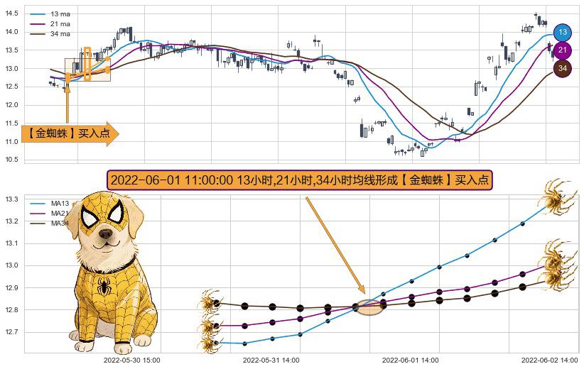 ⚀ 2022-06-01 11:00:00小时显现 13小时-21小时-34小时均线 【金蜘蛛】买入点 看多信号,后市看涨,买入