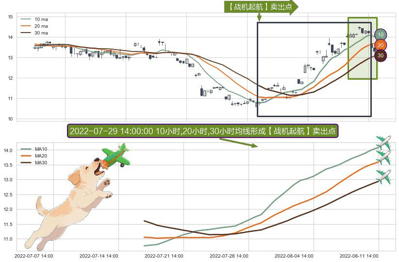⚀ 2022-07-18 14:00:00小时-2022-08-11 14:00:00小时显现 10小时-20小时-30小时均线 【战机起航】卖出点 看空信号,后市看跌,卖出