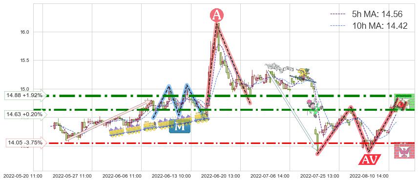 ♘ 阻力价格位14.88,可信任强度89.38%,距离最后交易2022-08-12 14:00形成的收盘价格14.60相差 +1.92%