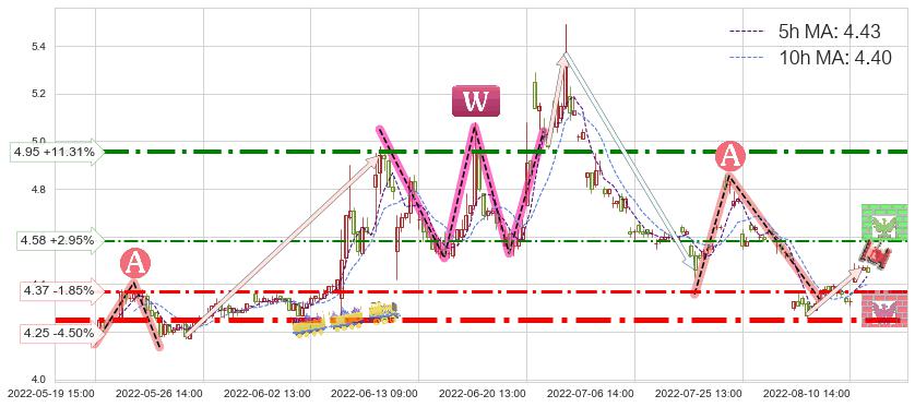 ♘ 阻力价格位4.58,可信任强度54.41%,距离最后交易2022-08-12 14:00形成的收盘价格4.45相差 +2.95%