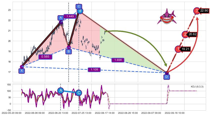 ➣ 未完成【鲨鱼】形态起点X: 05-20:09, 已到达C点: 07-05:14, 预测最终D点: 09-08:14, 共302交易小时