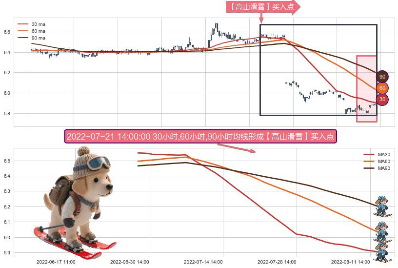⚀ 2022-06-29 13:00:00小时-2022-08-12 14:00:00小时显现 30小时-60小时-90小时均线 【高山滑雪】买入点 看多信号,后市看涨,买入