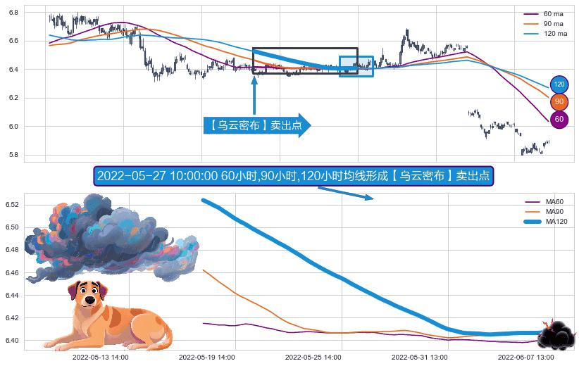 ⚀ 2022-05-18 13:00:00小时-2022-06-07 11:00:00小时显现 60小时-90小时-120小时均线 【乌云密布】卖出点 看空信号,后市看跌,卖出