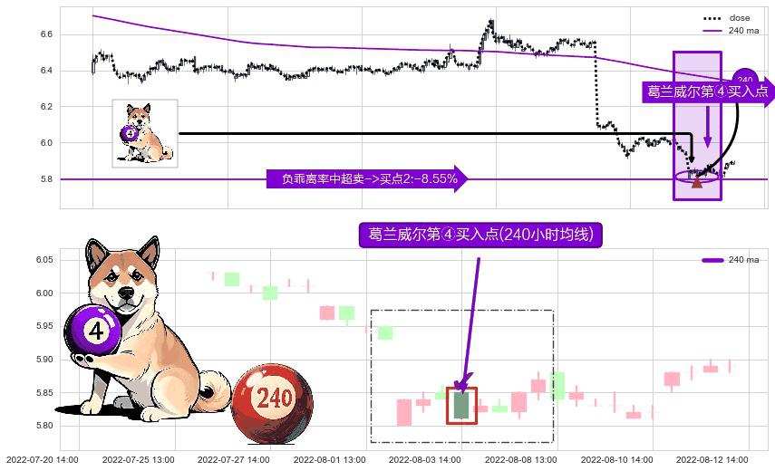 ⚀ 2022-08-03 14:00:00-小时显现 葛兰威尔均线 240小时均线 第④买入点 下降趋势均值回复的短线反弹信号,后市看涨,买进信号