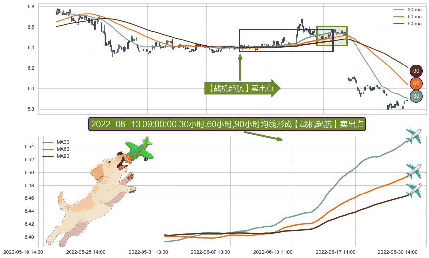 ⚀ 2022-05-31 11:00:00小时-2022-06-29 13:00:00小时显现 30小时-60小时-90小时均线 【战机起航】卖出点 看空信号,后市看跌,卖出