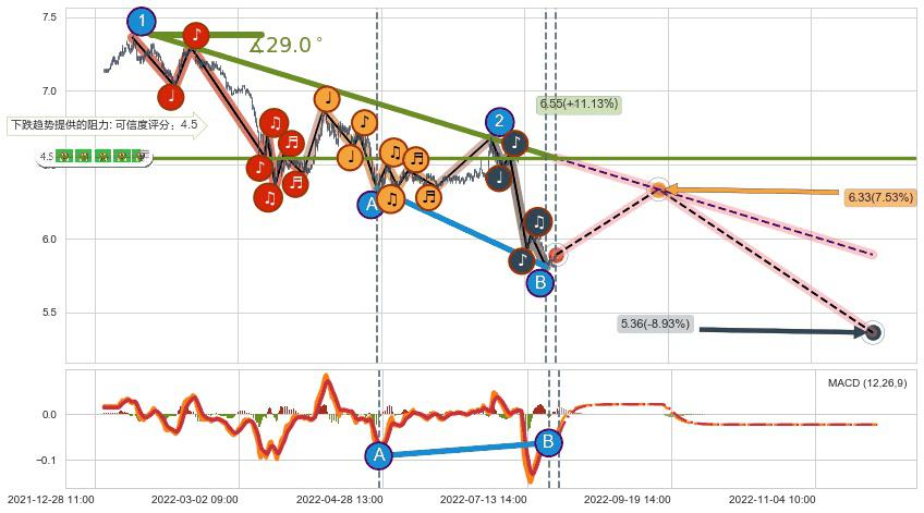 ♘ 在最后的下跌阶段2022-01-13 09:00至2022-08-12 14:00,存在 持续未破位的阻力位 ,阻力价格6.55,可信任强度87.38%,其距离最后价格5.89相差 +11.13%