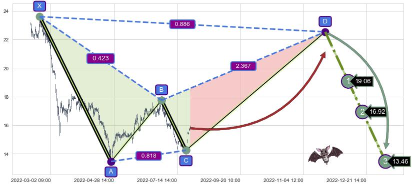 ➢ 距离预测D点位置有足够的上涨空间, 与看跌【蝙蝠】形态相反,实际方向【看涨】