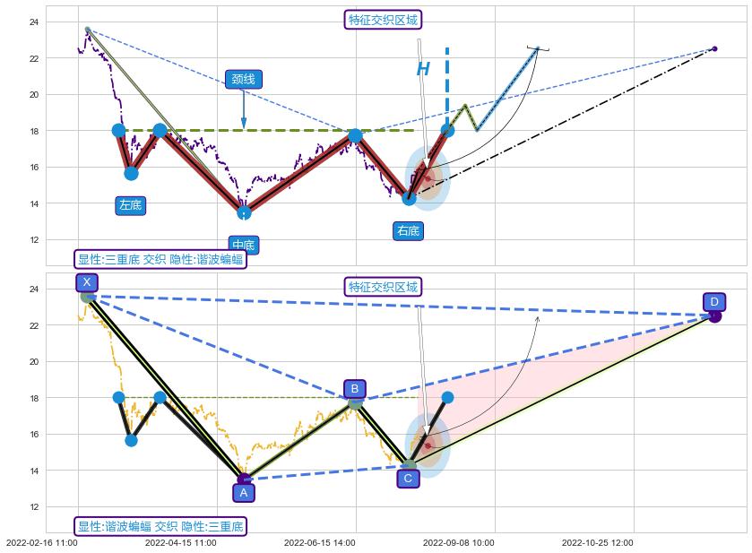 从2022-04-12 11:00至2022-05-24 09:00,共包含136个小时,阶段股价上涨0.06%,阶段股价变动位移路程比: 1 : 1843