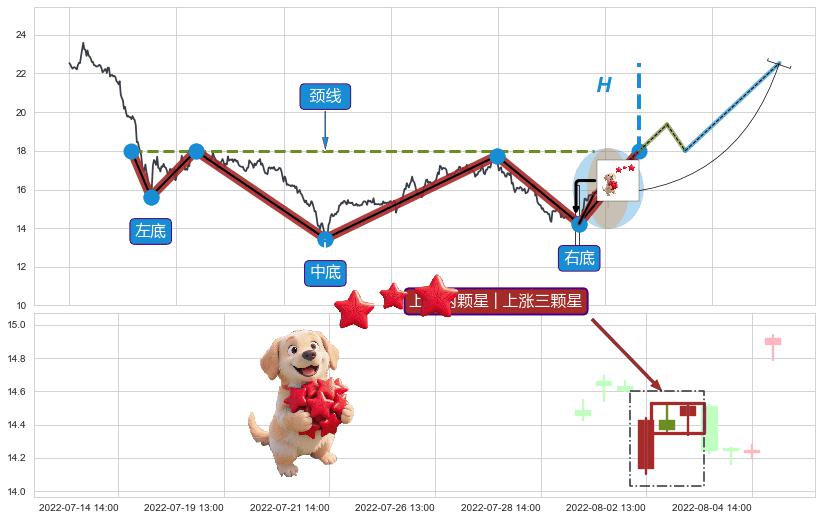 从2022-08-03 14:00至2022-08-12 14:00,共包含15个小时,阶段股价上涨10.52%,阶段股价变动位移路程比: 1 : 1.2