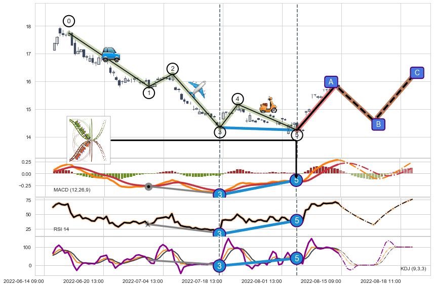 ➢ 1,3,5驱动浪MACD, RSI, KDJ走势都出现【常规背离】反转信号增强