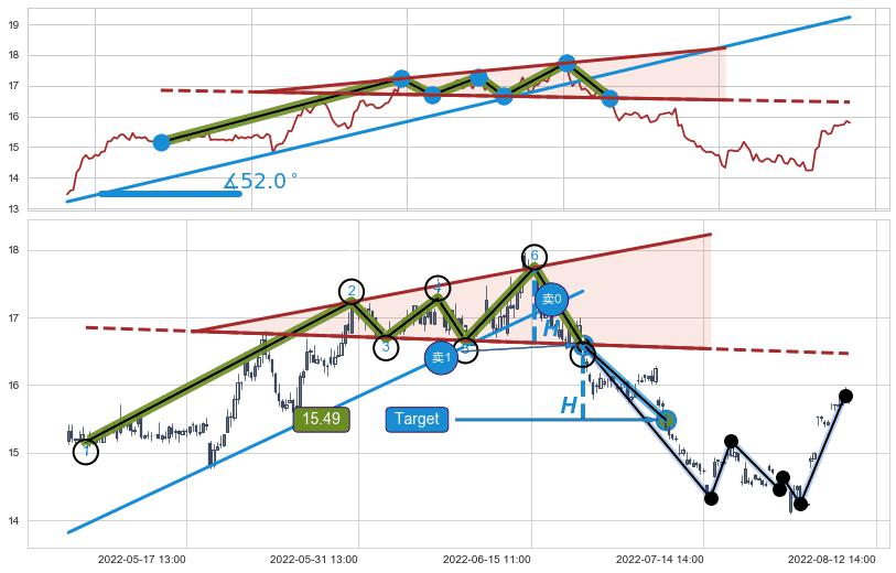 从2022-05-31 10:00至2022-06-14 14:00,共包含50个小时,阶段股价上涨2.36%,阶段股价变动位移路程比: 1 : 14