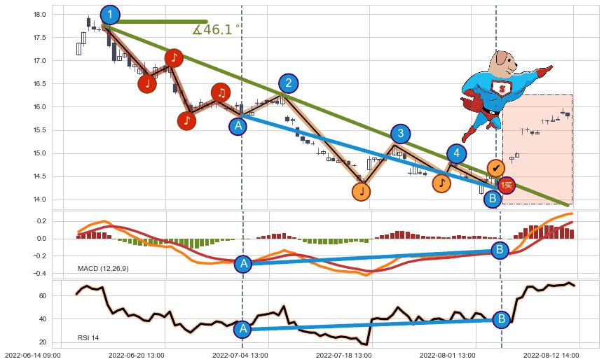 从2022-06-15 13:00至2022-08-05 13:00,共包含81个小时,阶段股价下跌-16.66%,阶段股价变动位移路程比: 1 : 4,下跌趋势角度: 46.1