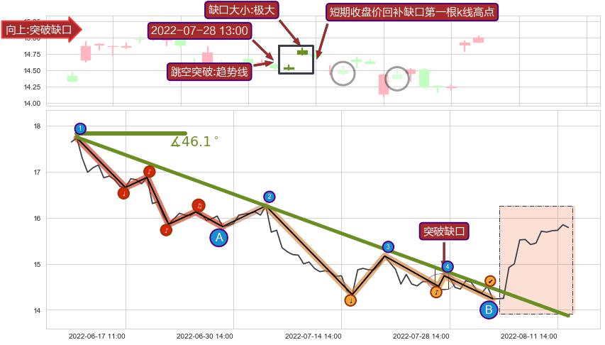 ⚔️ 2022-06-15 13:00-2022-08-05 13:00下跌趋势存在反转上涨[机会],其原下跌趋势的阻力位(13.87)已被突破[强支撑信号],原下跌趋势角度: 46.1˚