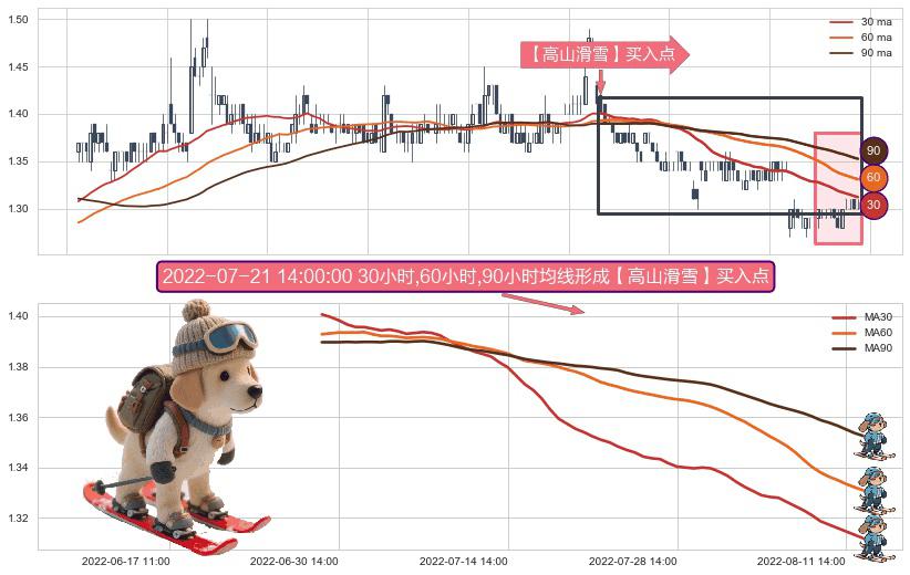 ⚀ 2022-06-29 14:00:00小时-2022-08-12 14:00:00小时显现 30小时-60小时-90小时均线 【高山滑雪】买入点 看多信号,后市看涨,买入
