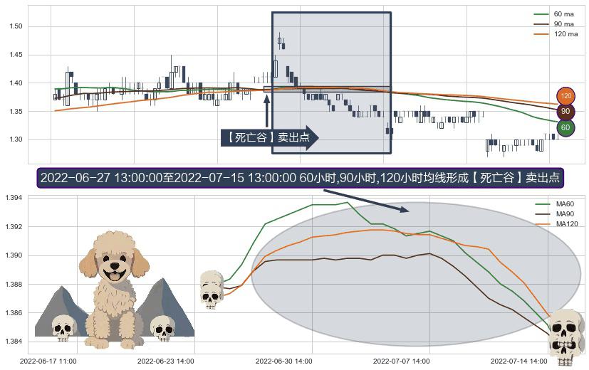 ⚀ 2022-06-27 14:00:00-小时至2022-07-15 13:00:00-小时显现 60小时-90小时-120小时均线 【死亡谷】卖出点 看空信号,后市看跌,卖出