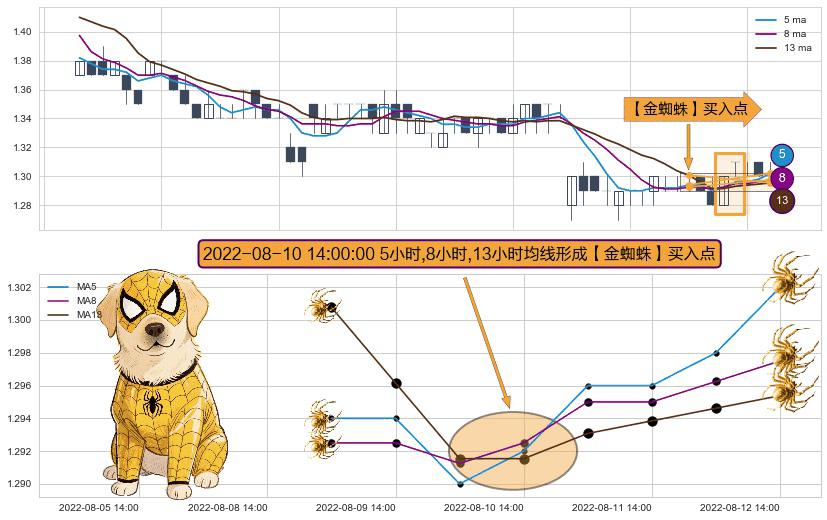 ⚀ 2022-08-10 14:00:00小时显现 5小时-8小时-13小时均线 【金蜘蛛】买入点 看多信号,后市看涨,买入