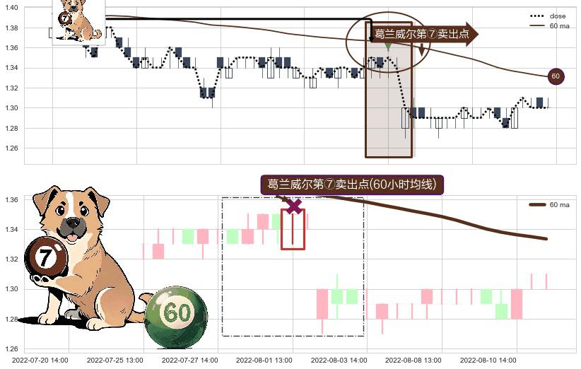 ⚀ 2022-08-01 13:00:00-小时显现 葛兰威尔均线 60小时均线 第⑦卖出点 下降趋势的中继信号,后市看跌,卖出信号