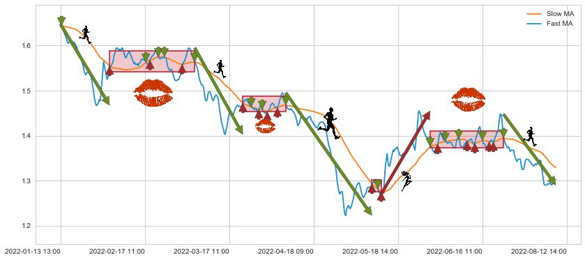 04-07 14:00至05-10 14:00 慢线与快线呈空头排列, 慢线与快线接触少,无缠绕