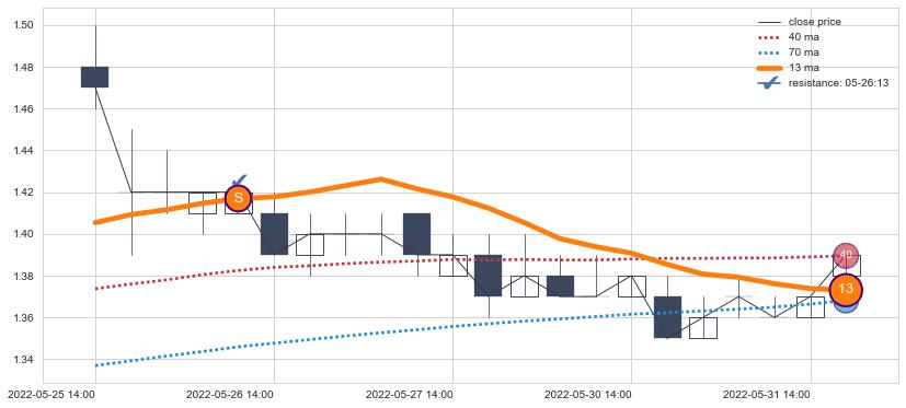 ⚃ 2022-06-21 13:00:00小时开盘价格在三条均线上收大阴线,收盘全跌破均线,收盘股价下跌-1.43%
