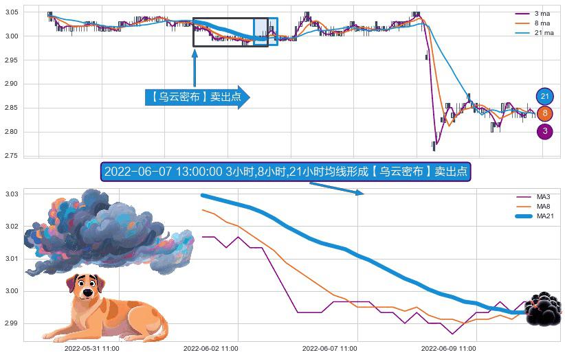 形态多维评估: ⚀ 2022-06-01 14:00:00小时-2022-06-10 11:00:00小时显现 3小时-8小时-21小时均线 【乌云密布】卖出点 看空信号,后市看跌,卖出