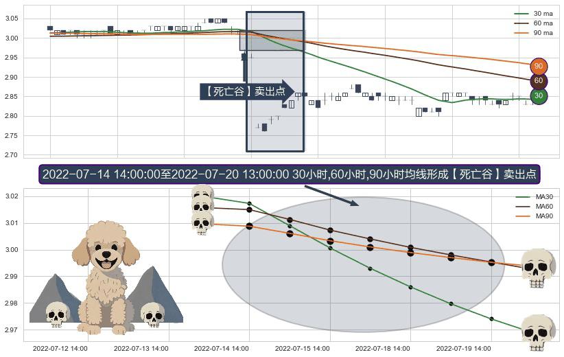 形态多维评估: ⚀ 2022-07-15 13:00:00-小时至2022-07-20 13:00:00-小时显现 30小时-60小时-90小时均线 【死亡谷】卖出点 看空信号,后市看跌,卖出