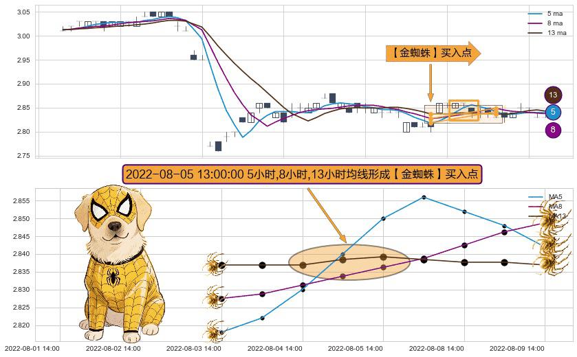 形态多维评估: ⚀ 2022-08-05 13:00:00小时显现 5小时-8小时-13小时均线 【金蜘蛛】买入点 看多信号,后市看涨,买入