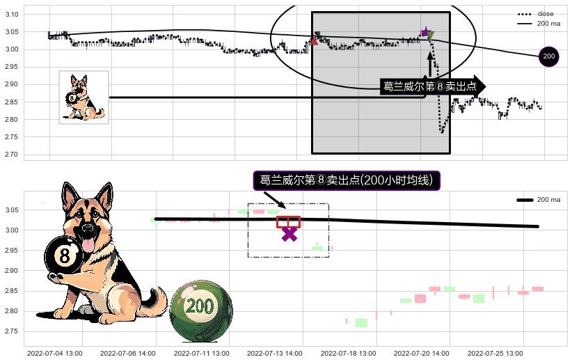 形态多维评估: ⚀ 2022-07-13 13:00:00-小时显现 葛兰威尔均线 200小时均线 第⑧卖出点 下降趋势的中继信号,后市看跌,卖出信号