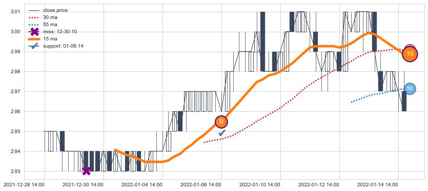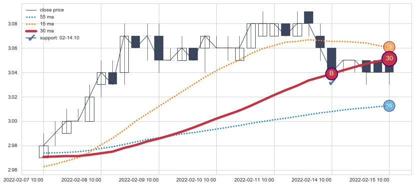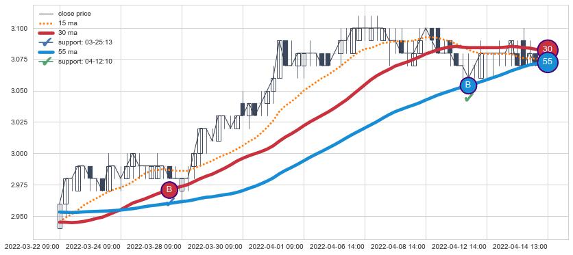 上涨趋势03-22 09:00-04-14 13:00,均线30, 55确认关键支撑2处