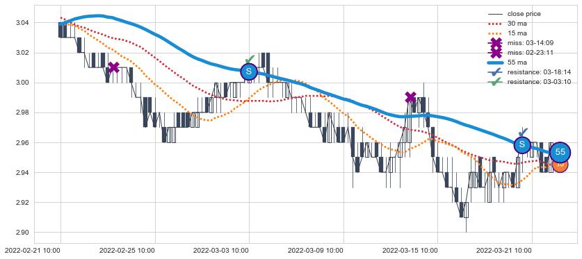 下跌趋势02-21 10:00-03-22 09:00,均线55确认关键阻力2处