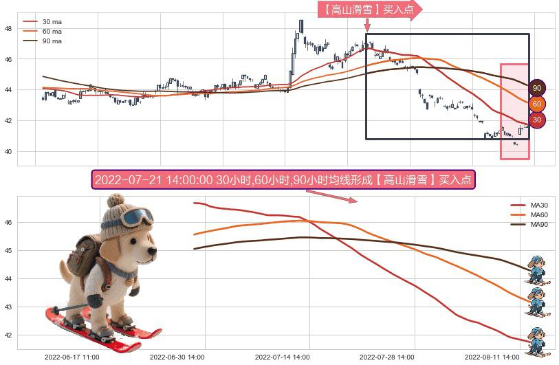 ⚀ 2022-06-29 14:00:00小时-2022-08-12 14:00:00小时显现 30小时-60小时-90小时均线 【高山滑雪】买入点 看多信号,后市看涨,买入