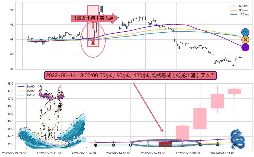 ⚀ 2022-06-14 13:00:00小时显现 60小时-90小时-120小时均线 【蛟龙出海】买入点 看多信号,后市看涨,买入