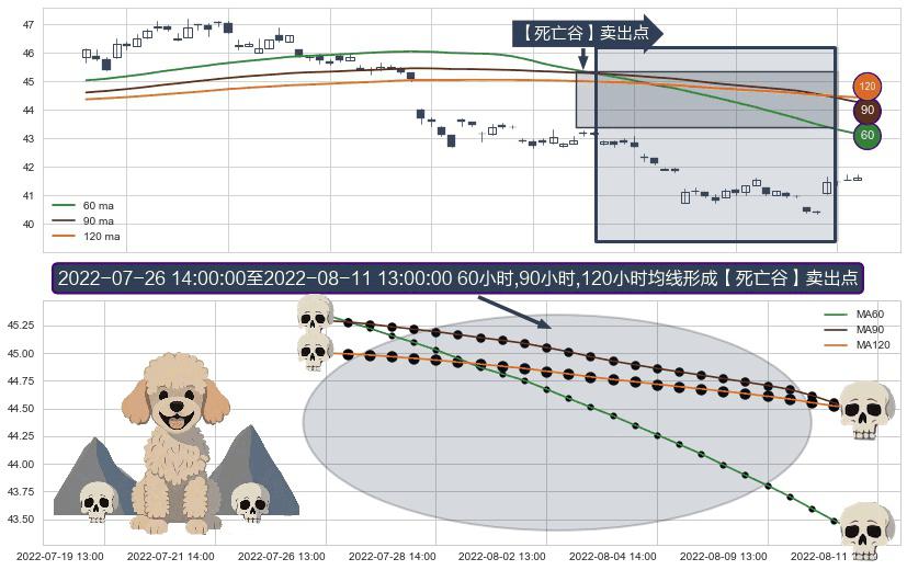 ⚀ 2022-07-27 13:00:00-小时至2022-08-11 13:00:00-小时显现 60小时-90小时-120小时均线 【死亡谷】卖出点 看空信号,后市看跌,卖出
